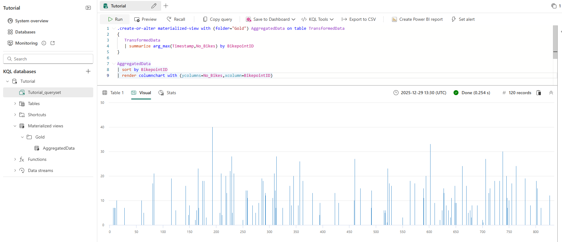 .create-or-alter materialized-view with (folder="Gold") AggregatedData on table TransformedData { TransformedData | summarize arg_max(Timestamp,No_Bikes) by BikepointID }Kopieren Sie und fügen Sie ein, und führen Sie dann die folgende Abfrage aus, um die Daten in der materialisierten Sicht als Säulendiagramm anzuzeigen.