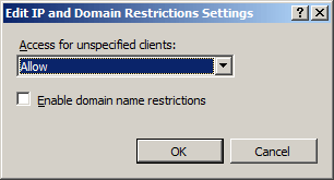 Wählen Sie das Standardzugriffsverhalten für nicht angegebene Clients aus, geben Sie an, ob Einschränkungen nach Domänenname aktiviert werden sollen, und klicken Sie dann auf OK.
