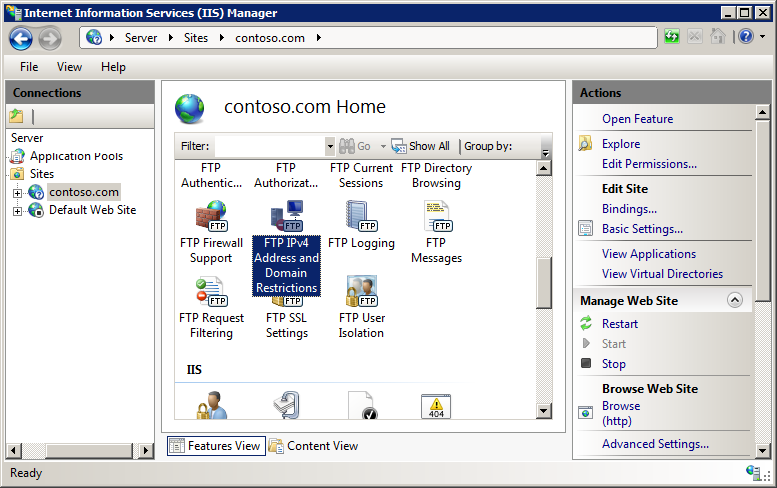 Klicken Sie im Feature FTP-Einschränkungen für IPv4-Adressen und Domänen im Bereich Aktionen auf Featureeinstellungen bearbeiten.