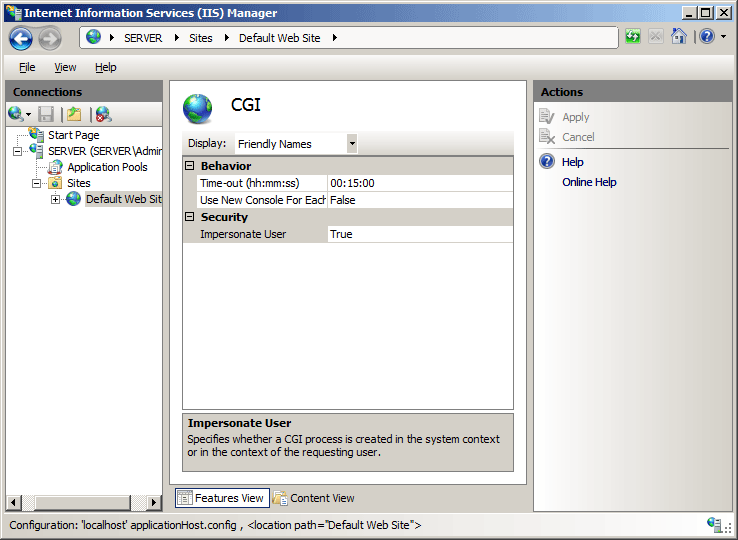Das <cgi>-Element konfiguriert Standardeinstellungen für CGI-Anwendungen (Common Gateway Interface, gemeinsame Gatewayschnittstelle) für Internetinformationsdienste 7 (Internet Information Services, IIS). Diese Einstellungen definieren die Umgebung, die IIS 7 beim Starten von CGI-Prozessen verwendet. Die Attribute createCGIWithNewConsole und createProcessAsUser geben beispielsweise an, wie eine CGI-Anwendung von IIS 7 gestartet wird, und das timeout-Attribut gibt an, wie lange eine CGI-Anwendung ausgeführt werden kann, bevor IIS den Prozess beendet.