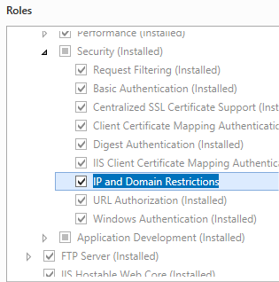 - Erweitern Sie auf der Seite Serverrollen den Webserver (IIS), erweitern Sie den Webserver, erweitern Sie Sicherheit, und wählen Sie dann IP- und Domäneneinschränkungen aus. Klicken Sie auf Weiter.
