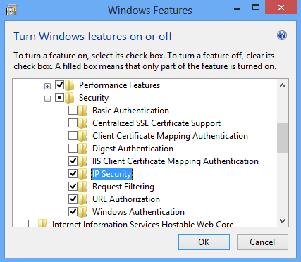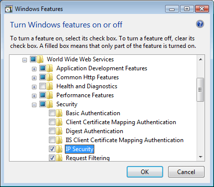 Die Standardinstallation von IIS enthält nicht den Rollendienst oder das Windows-Feature für die IP-Sicherheit. Um die IP-Sicherheit in IIS zu verwenden, müssen Sie den Rollendienst oder das Windows-Feature mithilfe der folgenden Schritte installieren: