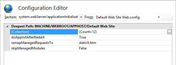 Falls Sie eine Site ausgewählt haben, wählen Sie im Textfeld Von die Option <Sitename> Web.config und anschließend im Textfeld Abschnitt die Option system.webServer/applicationInitialization aus.