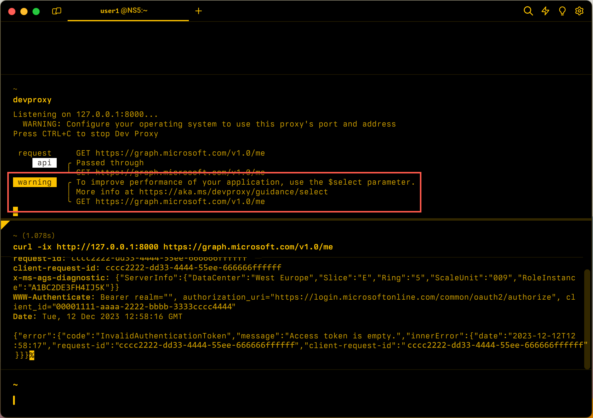 Zeigt eine Warnung an, wenn der Proxy eine Anforderung an Microsoft Graph-APIs abfangen, die den $select Abfragezeichenfolgenparameter nicht enthält.