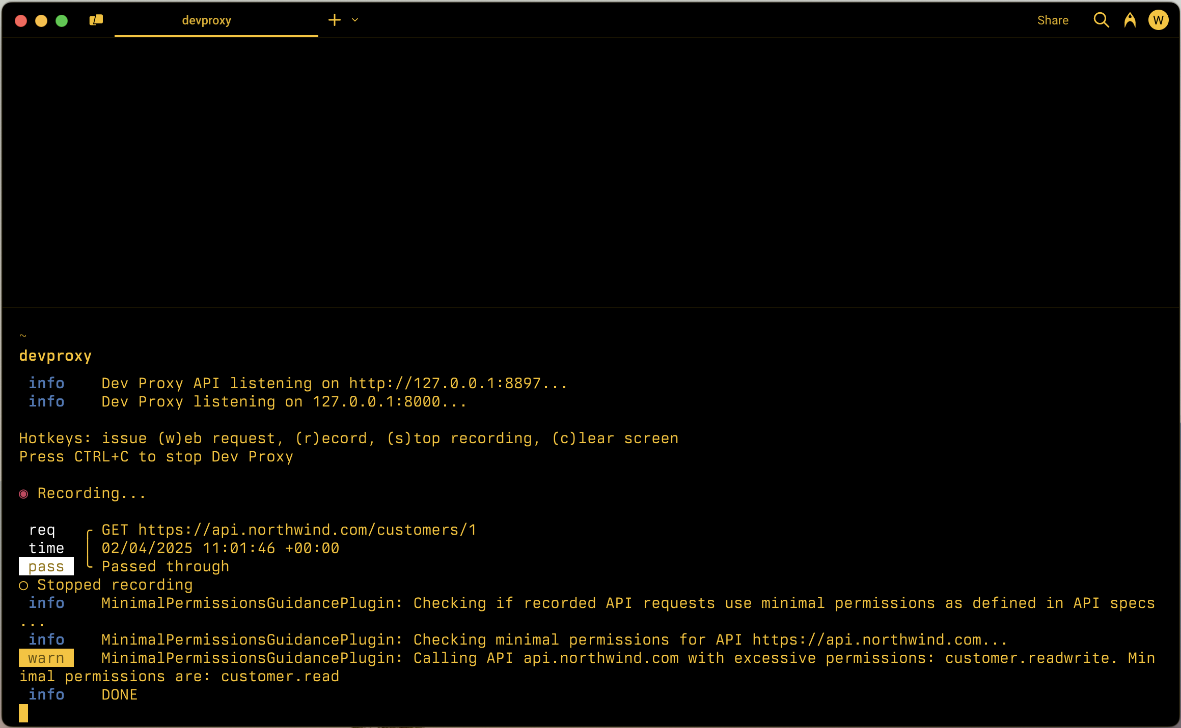 Das MinimalPermissionsGuidancePlugin Plug-In unterstützt die Überprüfung von OAuth-Berechtigungen für APIs, die mit OAuth gesichert sind. Das Plug-In berechnet die minimalen Berechtigungen, die zum Aufrufen der in der App verwendeten APIs mit den Informationen aus den bereitgestellten API-Spezifikationen erforderlich sind. Anschließend vergleicht das Plug-In die Berechtigungen, die im JSON-Webtoken (JWT) verwendet werden, mit den minimal erforderlichen Bereichen, die für die Anforderungen erforderlich sind, die von Dev Proxy aufgezeichnet wurden.