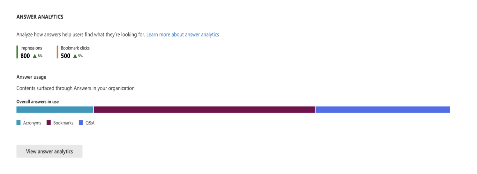 Im Microsoft Search-Nutzungsbericht erhalten Sie im Abschnitt Antwortanalyse Informationen zur Leistung der redaktionellen Lesezeichen, Akronyme und Q&A innerhalb der organization.