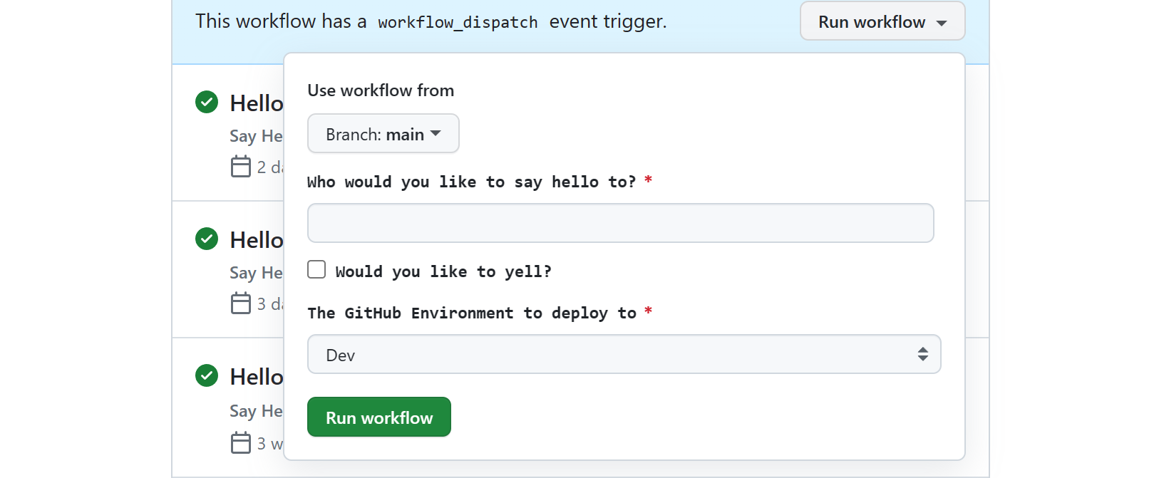 Glücklicherweise haben die meisten CI-Systeme, einschließlich GitHub-Aktionen und Azure-Pipelines, die Möglichkeit, einen Workflow mit Eingaben einzurichten, die Sie dann manuell über ihre UIs oder CLIs auslösen können. Da Entwickler und damit verbundene Operationsrollen wahrscheinlich bereits mit diesen Benutzeroberflächen vertraut sind, können manuelle Trigger das alles als Codemuster erweitern, um die Automatisierung für Aktivitäten (oder Aufträge) zu ermöglichen, die weder über eine natürliche Dateidarstellung verfügen noch vollständig automatisiert werden sollten, ohne dass ein PR-Prozess erforderlich ist.