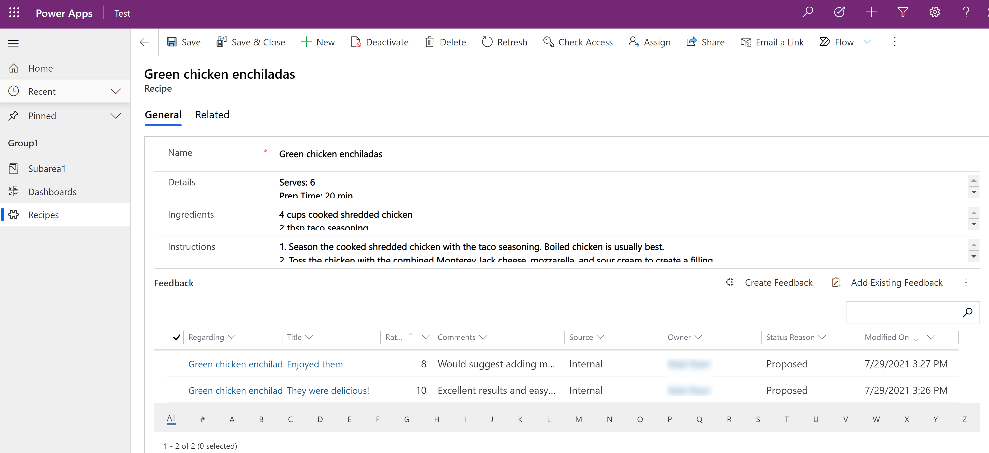 Standardmäßig müssen Benutzer zur Liste der verknüpften Datensätze des Datensatzes wechseln, für den Sie Feedback hinzufügen möchten. Um Benutzern das Hinzufügen von Feedback zu erleichtern, sollten Sie dem Formular der Tabelle, für die Sie Feedback aktivieren, ein Feedback-Untergrid hinzufügen, z. B. im weiter oben in diesem Artikel dargestellten Rezeptbeispiel.