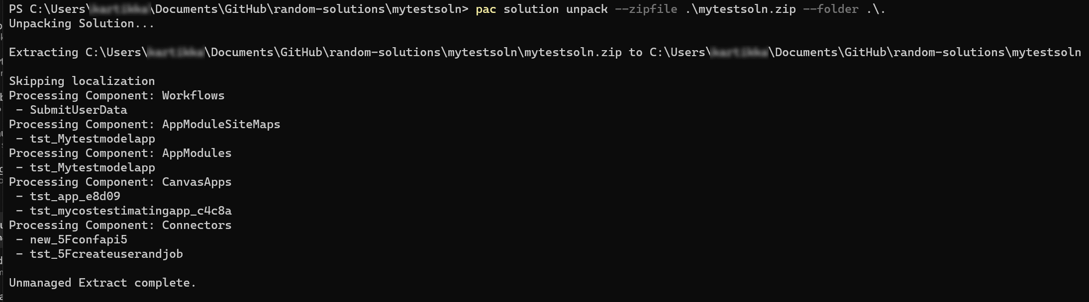 pac solution unpack --zipfile C:\SampleSolution.zip --folder .\SampleSolutionUnpacked\.