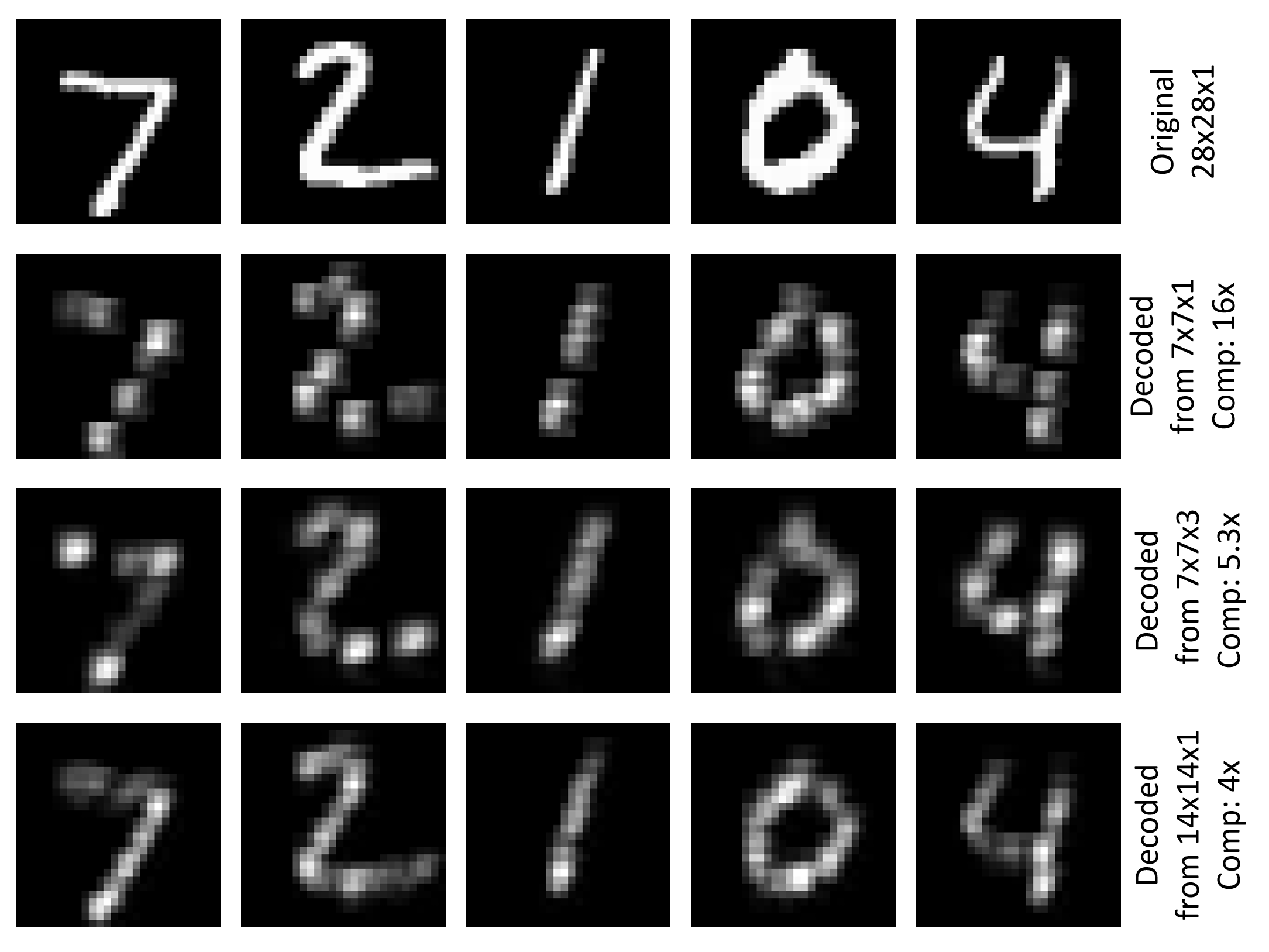 Der Decoderteil komprimiert die ursprünglichen 784 (28x28) Zahlen auf 49 (7x7), einen Faktor von 16. Die Verwendung nur einer Tiefe 1 für die ConvolutionalLayer hat den Vorteil, dass die Encoderergebnisse auf aussagekräftige Weise dargestellt werden können (siehe Abbildung oben auf dieser Seite). Man kann die Anzahl der konvolutionalen Filter erhöhen, z. B. cMap=3 weniger Komprimierung und hoffentlich bessere Decodierungsergebnisse. In diesem Beispiel wird der RMSE für Schulungen und Tests auf 0.196reduziert. Eine weitere Möglichkeit, weniger Komprimierung zu haben, besteht darin, ein kleineres Filter-Shape zu verwenden und für die Poolebene zu stride. Die Verwendung (2:2) für pooling und unpooling führt zu einem codierten Tensor der Größe 14x14x1 und reduziert die RMSE in diesem Beispiel auf 0.136 Schulungen und 0.131 tests. Die folgende Abbildung zeigt die Visualisierung des originalen Bilds und das decodierte Bild für die ersten fünf Bilder des MNIST-Testsatzes für die drei behandelten Einstellungen.