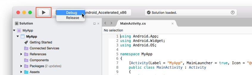 Im oberen Bereich von Visual Studio ist ein Dropdownmenü, mit dem der Modus Debuggen oder Release ausgewählt werden kann. Durch Auswählen von Debuggen wird der Debugger an den Anwendungsprozess angefügt, der innerhalb des Emulators ausgeführt wird, nachdem die App gestartet wurde. Die Auswahl des Modus Release deaktiviert den Debugger (Sie können die App jedoch weiterhin ausführen und Protokollanweisungen zum Debuggen verwenden). Nachdem Sie ein virtuelles Gerät aus dem Geräte-Dropdownmenü ausgewählt haben, wählen Sie entweder den Modus Debuggen oder Release aus, und klicken Sie anschließend auf die Schaltfläche Wiedergeben, um die Anwendung auszuführen: