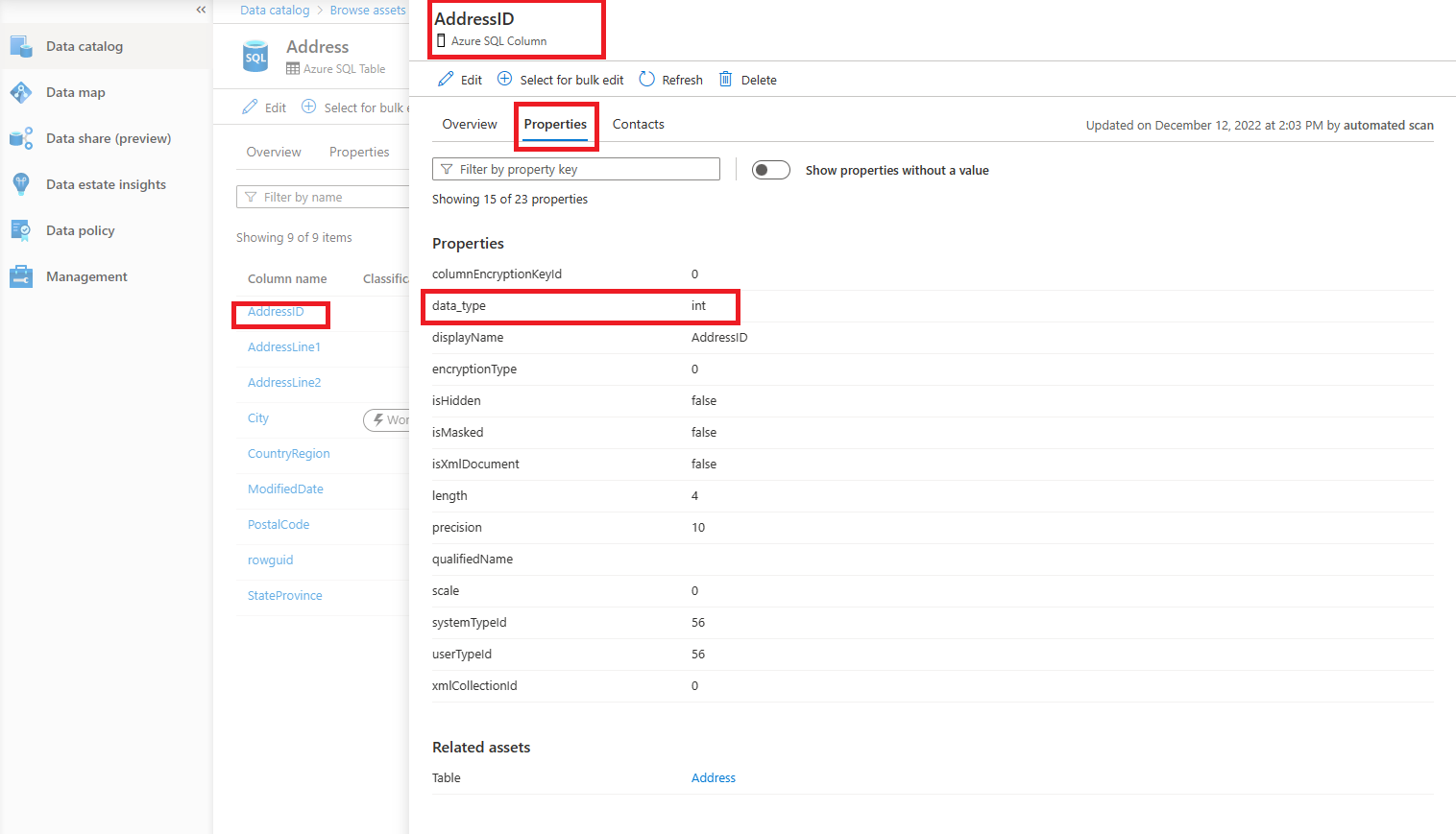 - Das zugehörige Objekt ist vom Typ azure_sql_column, wie im typeName-Attribut sichtbar.