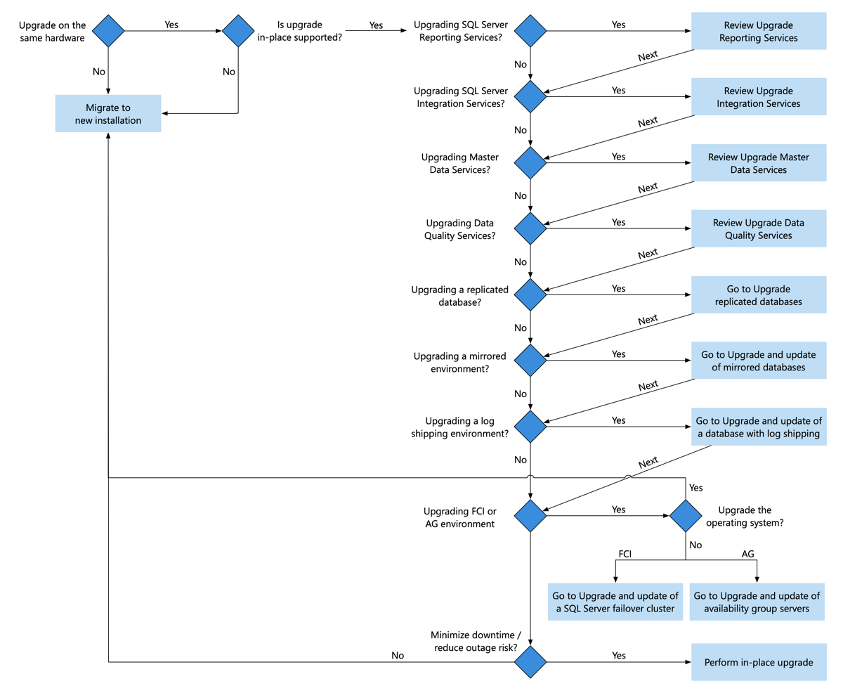 Es gibt verschiedene zu prüfende Ansätze beim Planen des Upgrades der Datenbank-Engine von einer früheren Version von SQL Server, um Ausfallzeiten und Risiken zu minimieren. Sie können ein direktes Upgrade ausführen, zu einer neuen Installation migrieren oder ein paralleles Upgrade vornehmen. Das folgende Diagramm hilft Ihnen, zwischen diesen Ansätzen auszuwählen. Jeder Ansatz im Diagramm wird zudem im Artikel erläutert. Um Sie bei den Entscheidungspunkten im Diagramm zu unterstützen, überprüfen Sie auch den Plan, und testen Sie den Upgradeplan des Datenbankmoduls.