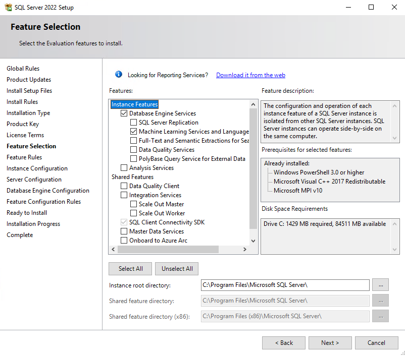 Datenbank-Engine-Dienste: Sie müssen eine Instanz der Datenbank-Engine installieren, um Spracherweiterungen mit SQL Server verwenden zu können. Sie können entweder eine Standardinstanz oder eine benannte Instanz verwenden.