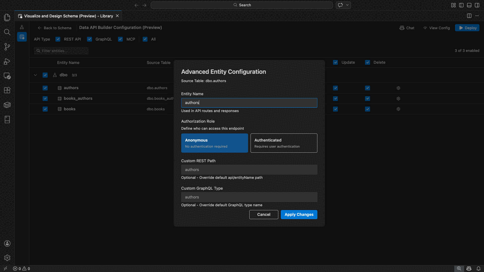 - Konfigurieren Sie erweiterte Entitätseinstellungen, einschließlich benutzerdefinierter REST-Pfade, benutzerdefinierter GraphQL-Typnamen und Autorisierungsrollen.