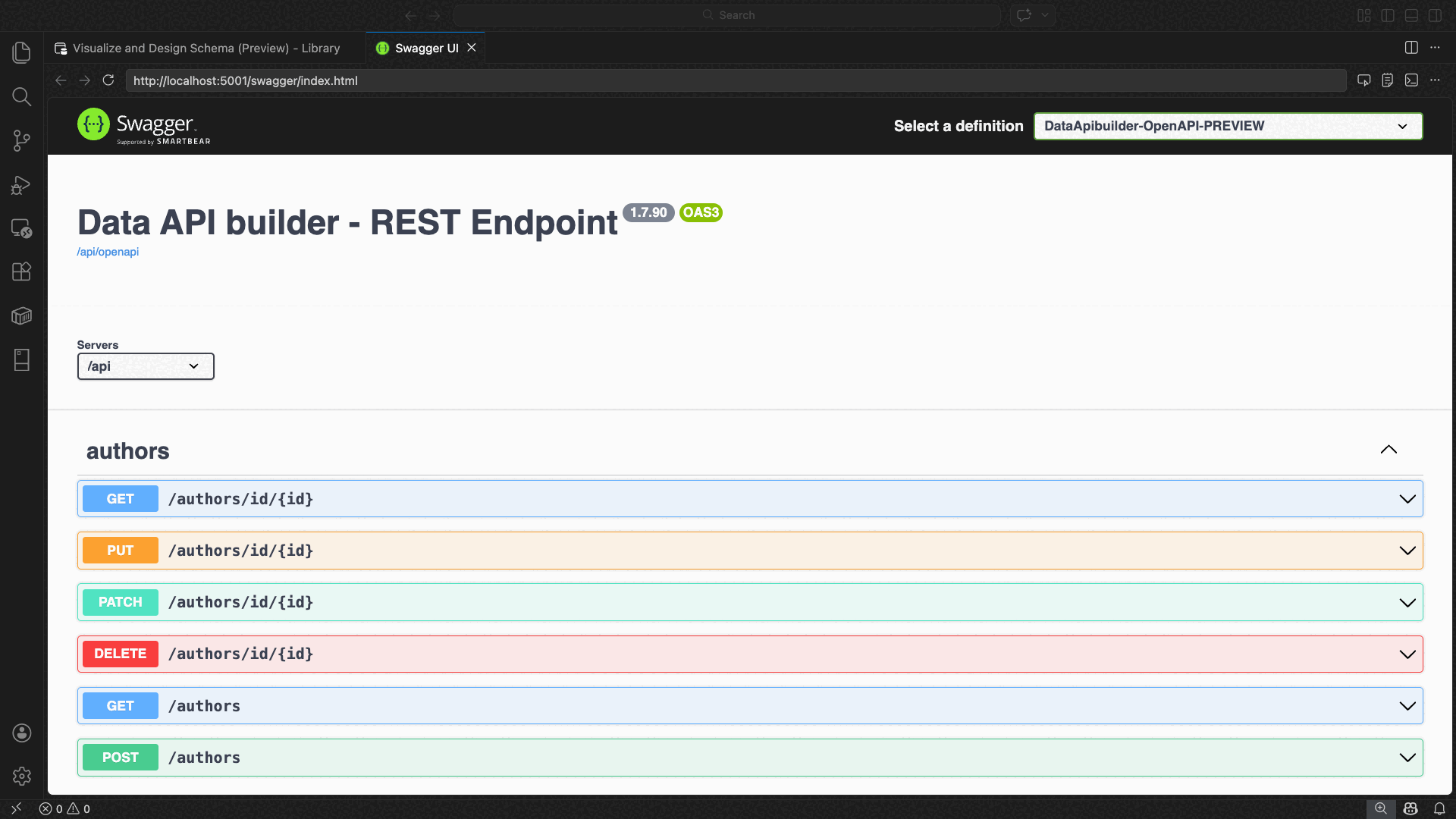Das folgende Beispiel zeigt die Swagger-Benutzeroberfläche zum Testen von REST-Endpunkten direkt in Visual Studio Code: