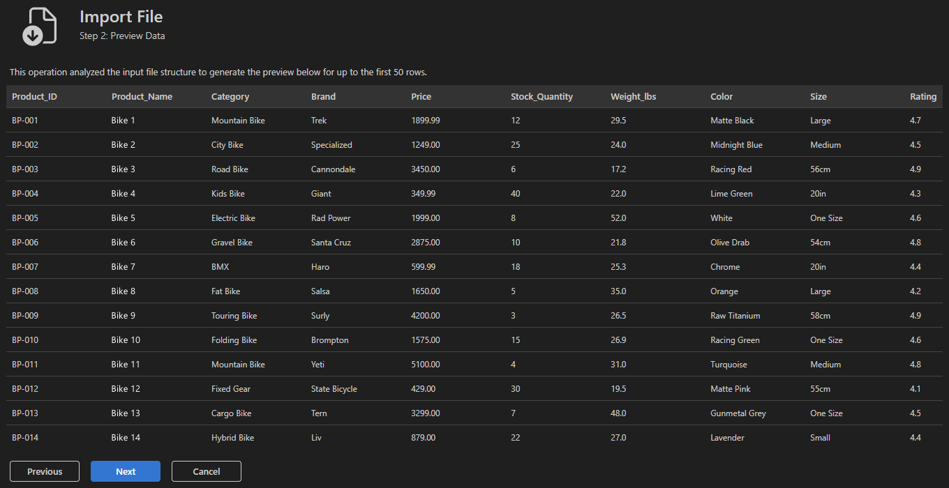 Der Assistent analysiert die Eingabedatei und generiert eine Vorschau der Daten. Er leitet Spaltennamen und Datentypen automatisch ab. Verwenden Sie diesen Schritt, um die Spaltenausrichtung, Trennzeichen und Datenformatierung zu überprüfen.