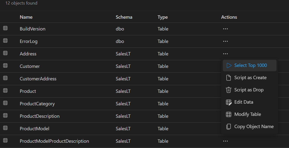 Jede Ergebniszeile enthält ein Menü "Aktionen " (...) mit allgemeinen Vorgängen wie Skriptoptionen, "Daten bearbeiten", " Daten ändern" und " Objektname kopieren".