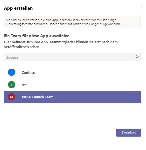 Es wird eine Meldung angezeigt, die besagt, dass Sie die erste Person sind, die eine App in diesem Team erstellt.