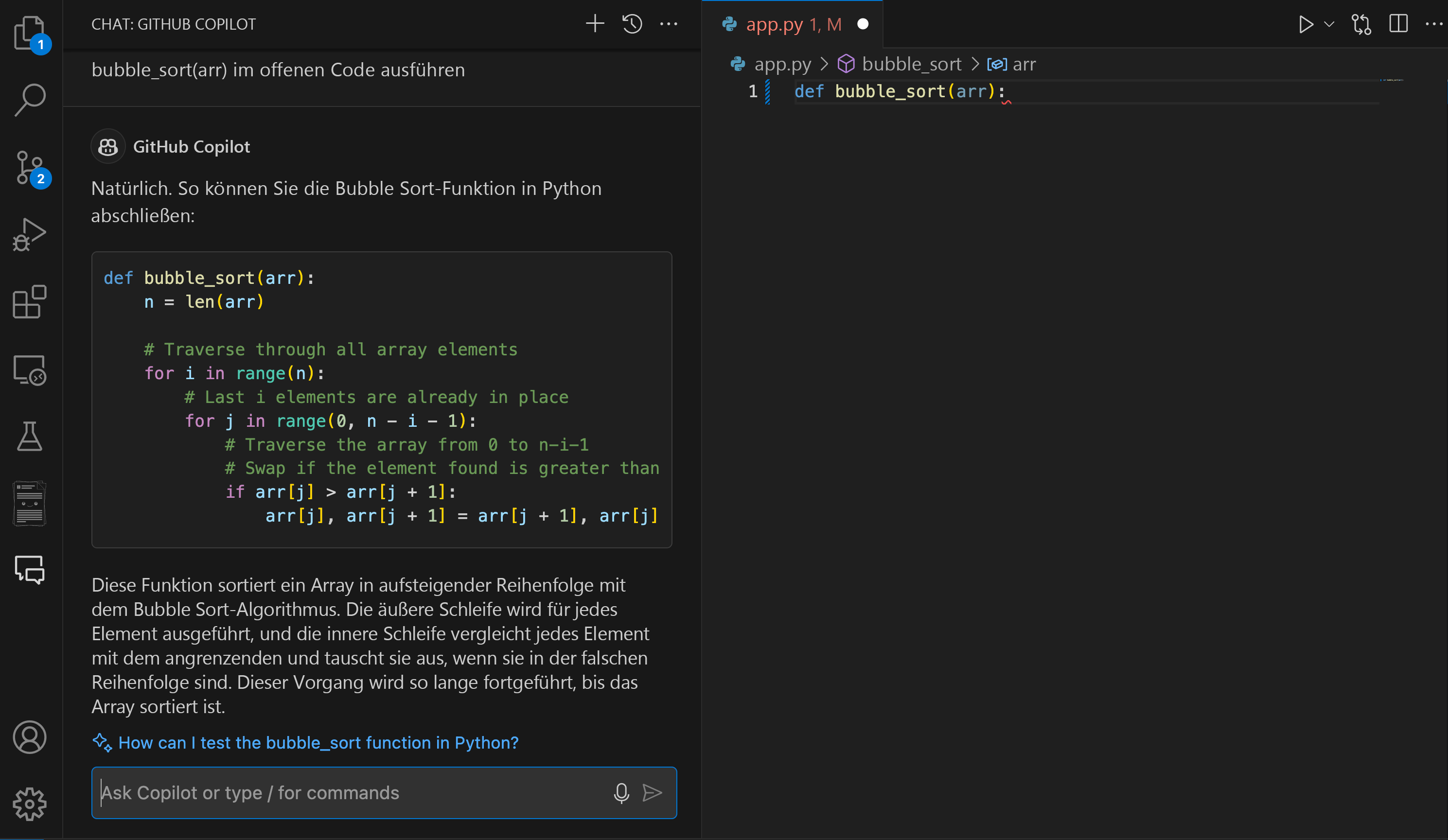 Komplexe Codegenerierung: Wenn Sie komplexe Algorithmen, Datenstrukturen implementieren oder Codebausteine für bestimmte Entwurfsmuster generieren müssen, kann Copilot Chat zur Optimierung des Prozesses beitragen. Es kann dazu beitragen, komplexe reguläre Ausdrücke zu erstellen, detaillierte SQL-Abfragen zu erstellen oder erweiterte Datenstrukturen wie eine Blasensortierung in Python zu entwickeln.