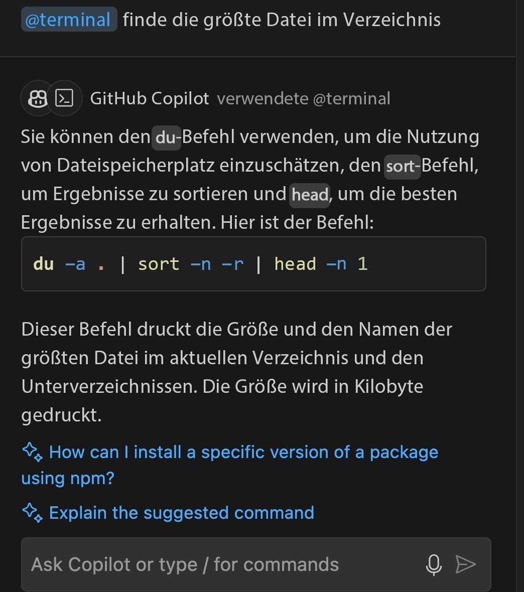controller.jsarbeiten, können Sie den Befehl #file verwenden, um sie auszuwählen und direkt in Ihrer Frage mit#file:controller.jsdarauf zu verweisen. Dieses Feature weist Copilot Chat an, sich beim Generieren einer Antwort auf den Inhalt dieser Datei zu konzentrieren.Umgebungsreferenzen: Sie können den Copilot-Chat zusammen mit Ihrem Terminal verwenden, um Hilfe basierend auf der Befehlsausgabe zu erhalten. Auf diese Weise kann Copilot das Debuggen unterstützen und Vorschläge basierend auf den Vorgängen in Ihrem Terminal bereitstellen. Beispiel: "@terminal wie kann ich diesen Fehler beheben?" Es ermöglicht Copilot, die Terminalausgabe zu analysieren und relevante Lösungen vorzuschlagen.
