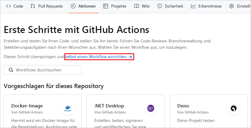 Wählen Sie auf der Get started with GitHub Actions Seite den set up a workflow yourself Link aus.