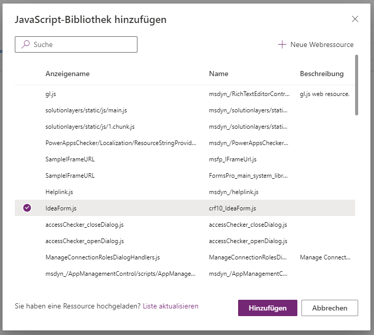 Geben Sie IdeaForm.js als Name sowie IdeaForm.js als Anzeigename ein, wählen Sie dann Java script (JS) als Typ aus, und wählen Sie dann Datei auswählen aus.
