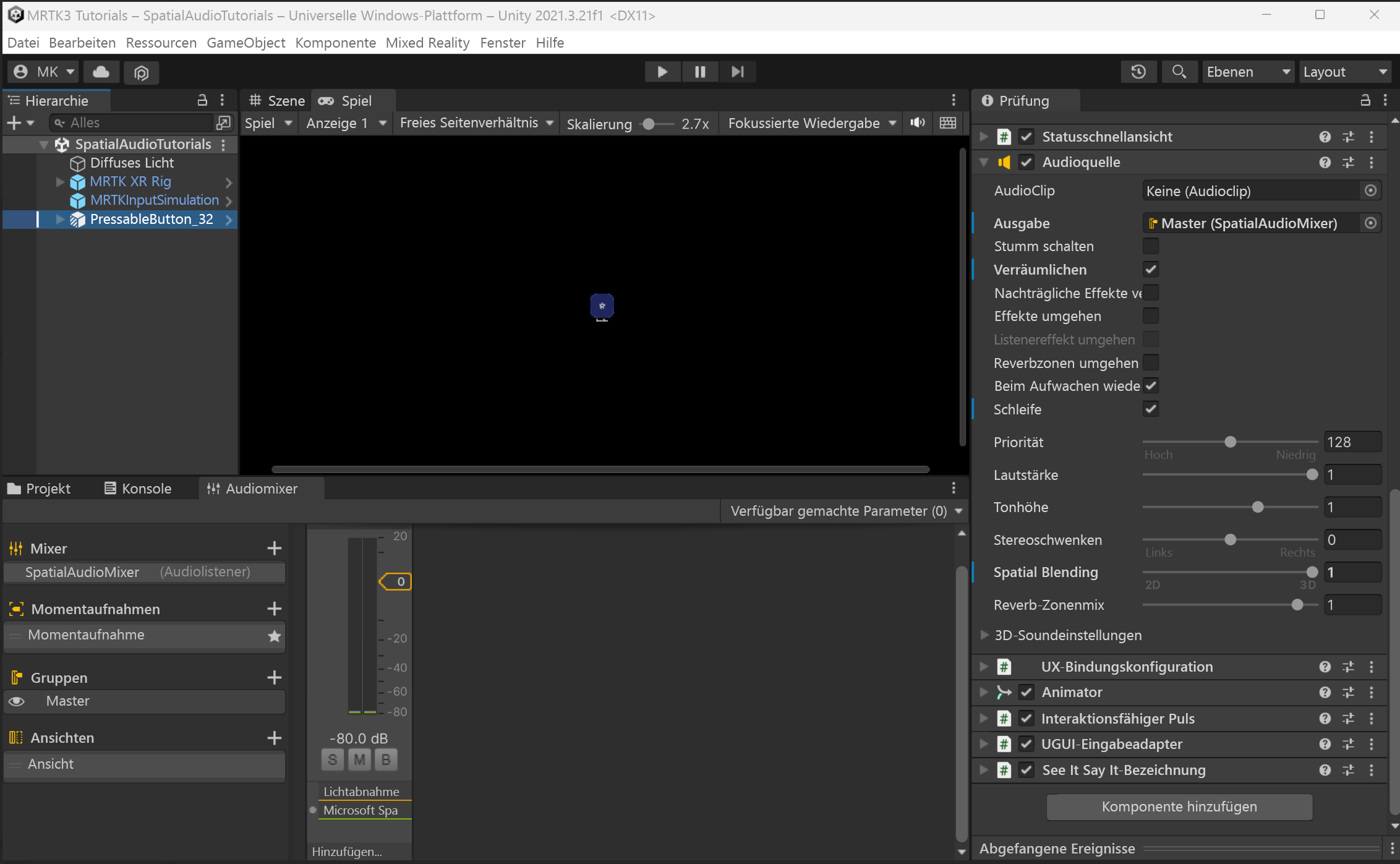 In dieser Lektion erfahren Sie, wie Sie die Schaltflächeninteraktionssounds räumlicher gestalten und erfahren, wie Sie mithilfe eines Audioclips räumliche Schaltflächeninteraktionen testen.