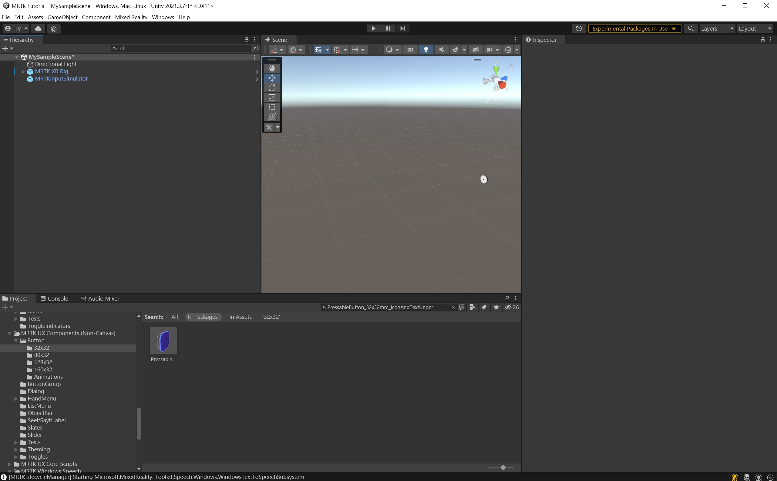 Um das Schaltflächen-Prefab hinzuzufügen, wählen Sie im Projektfenster"Pakete " aus, und geben Sie in der Suchleiste "PressableButton_32x32mm_IconAndTextUnder" ein.