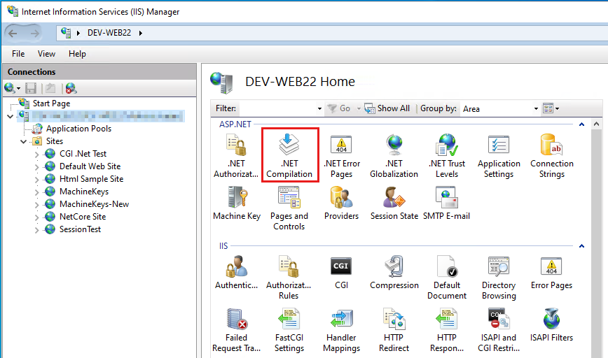 Wählen Sie im mittleren Bereich des IIS-Managers das .NET-Kompilierungssymbol aus: