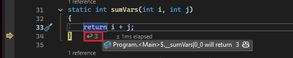 Ab Visual Studio 2022, Version 17.12, können Sie Rückgabewerte von Methodenaufrufen inline und nicht nur im Fenster "Autos" anzeigen.