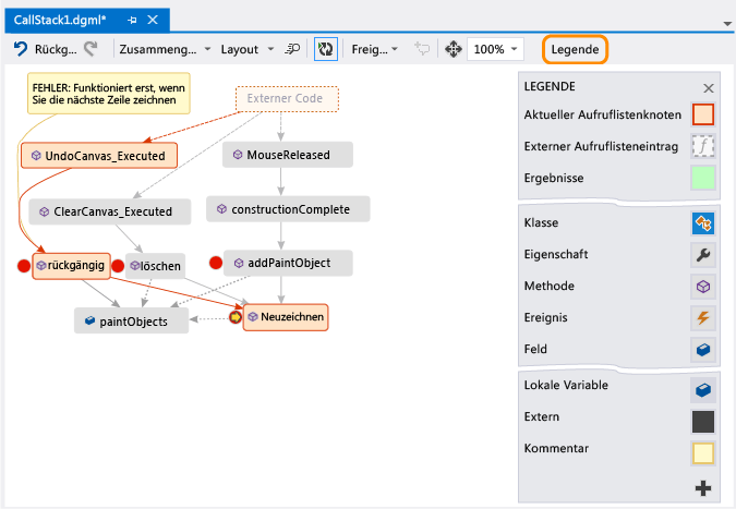 aus. Die Karte hebt weiterhin vorhandene Aufrufstapel hervor. Um den aktuellen Aufrufstapel manuell zur Karte hinzuzufügen, drücken Sie STRG+UMSCHALT+`.