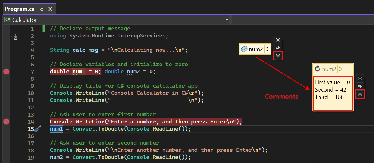 Der Kommentarbereich eines Datentipps hilft dabei, beim Debuggen Ihres Codes Notizen über Variablen festzuhalten. Diese Region ist ein praktischer Ort, um unterschiedliche Werte nachzuverfolgen, während sie sich beim Debuggen ändern. Sie können Kommentare in einem angehefteten oder unverankerten Datentipp hinzufügen.
