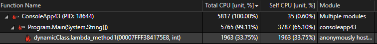Compiler generated code. Some operations generate code that isn’t intuitive. For example, async/await patterns generate state machines. Other examples include getters/setters, pattern matching, event handlers, query syntax for LINQ, source generators (for example, creation of source generators for json serialization), and other code features. In these scenarios, some generated code may appear in the call tree.