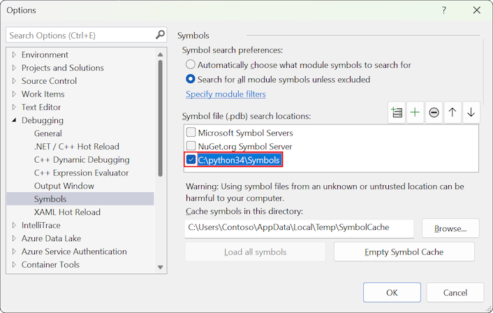 Geben Sie den Speicherort an, an dem sich die Datei python.pdb befindet, z. B . "c:\python34\Symbols", wie in der folgenden Abbildung dargestellt.