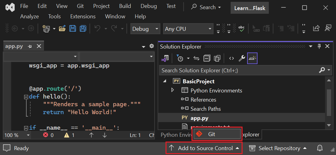 Wählen Sie unten rechts im Hauptfenster von Visual Studio die Option "Zur Quellcodeverwaltung hinzufügen " aus, um das Projekt auf Ihr lokales Quellcodeverwaltungssteuerelement zu übernehmen, und wählen Sie dann Git aus: