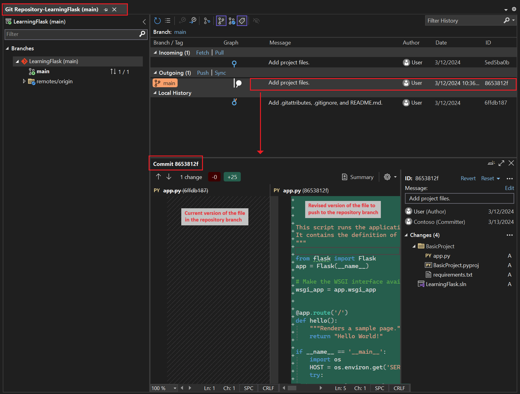 Gewöhnen Sie sich im Laufe dieses Tutorials an, regelmäßig die Git-Steuerelemente in Visual Studio zu verwenden, um Änderungen zu übertragen und zu veröffentlichen. Dieses Lernprogramm erinnert Sie an die entsprechenden Punkte.