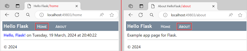 aboutVorlage auch auf die Basisvorlage verweist und dencontent-Block außer Kraft setzt:{% extends "layout.html" %} {% block content %} {{ content }} {% endblock %}Führen Sie die App erneut aus, und beobachten Sie die Ergebnisse. Verwenden Sie die Navigationsleistenlinks, um zwischen App-Seiten zu wechseln.