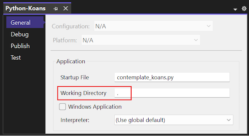 .). Beachten Sie, dass die Startdatei keinen bestimmten Ordnerspeicherort hat.Der geklonte Programmcode sucht nach einer Datei namens koans.txt im Arbeitsverzeichnis. Der Code erwartet, dass das Verzeichnis der Ordnerspeicherort ist, an dem Sie Visual Studio angewiesen haben, die geklonten Repositorydateien zu speichern. Wenn Sie das Arbeitsverzeichnis auf den Projektstamm