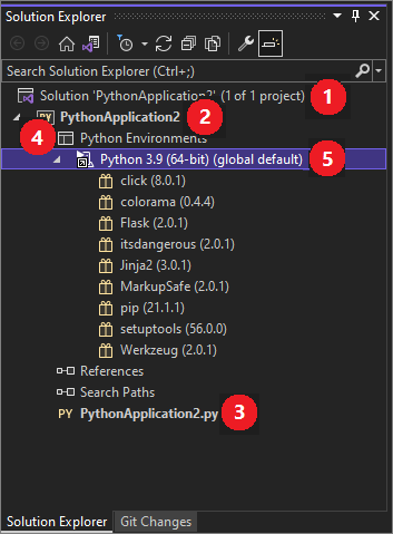 Suchen Sie unter Ihrem Projektknoten den Python-Umgebungen-Knoten(4). Erweitern Sie den Knoten, um die verfügbaren Python-Dolmetscher anzuzeigen.