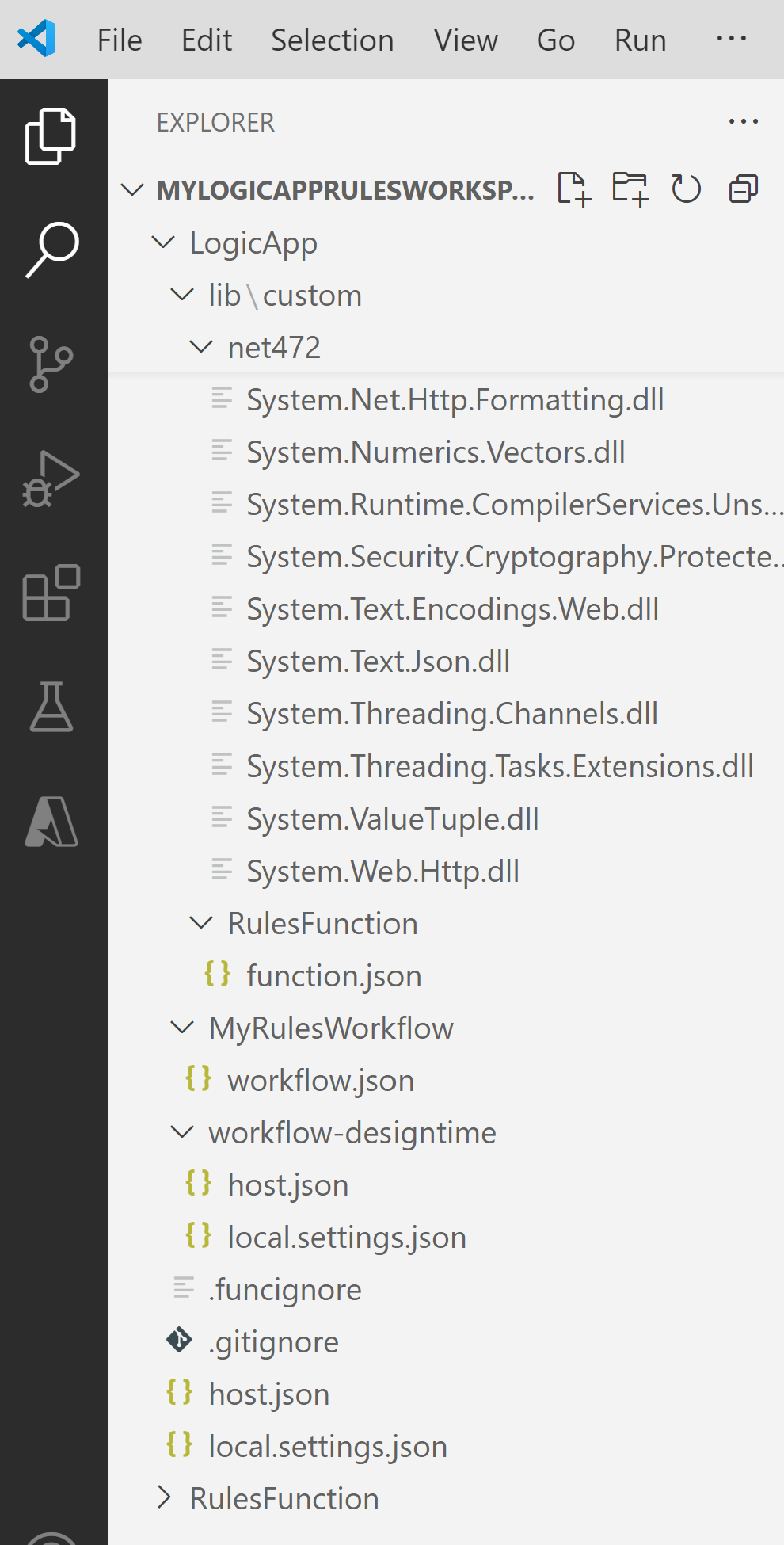 • In your workspace, expand the following folders: LogicApp > lib\custom > net472. Confirm that the subfolder named net472 contains the multiple assemblies required to run your code, including a file named <function-name>.dll.