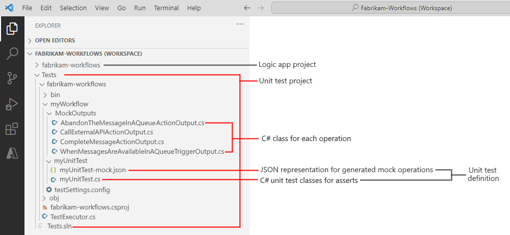 In the Explorer window, a new project folder named Tests appears under your logic app project folder. The Tests folder contains the following folders and files:
