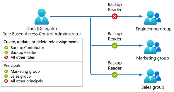 In this example, Dara can only assign (or remove) the Backup Contributor or Backup Reader roles to the Marketing and Sales groups.