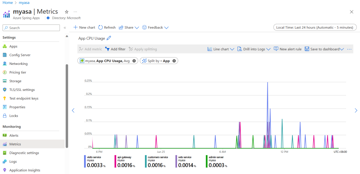 This section explains how to use the default metrics defined by Spring Boot and custom metrics defined in the application code. These metrics are available for applications running on Azure Spring Apps.