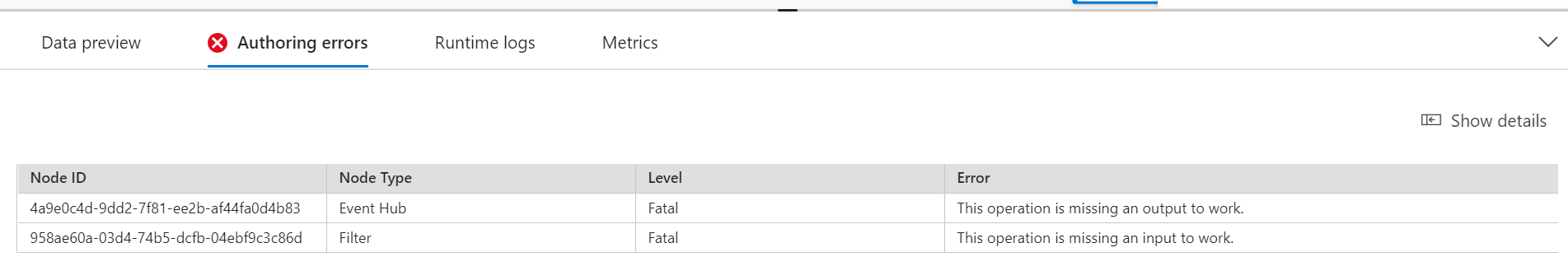 - Tabs for data preview, authoring errors, runtime logs, and metrics: For each tile, the data preview shows you results for that step (live for inputs; on demand for transformations and outputs). This section also summarizes any authoring errors or warnings that you might have in your job when it's being developed. Selecting each error or warning selects that transform. It also provides the job metrics for you to monitor the running job's health.