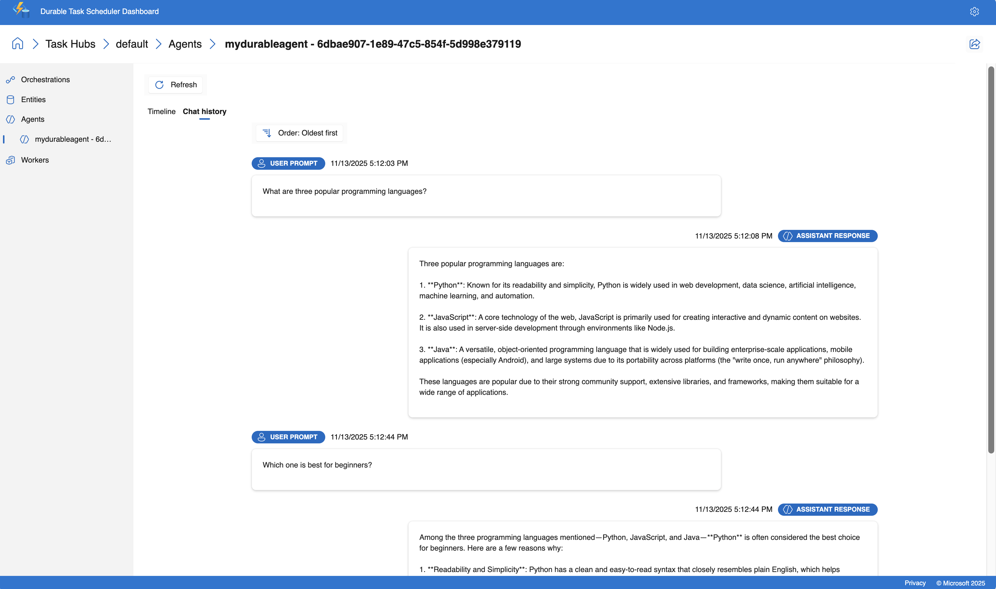Agents maintain persistent threads that survive across multiple interactions. Each thread is identified by a unique thread ID and stores the complete conversation history in durable storage managed by the Durable Task Scheduler.