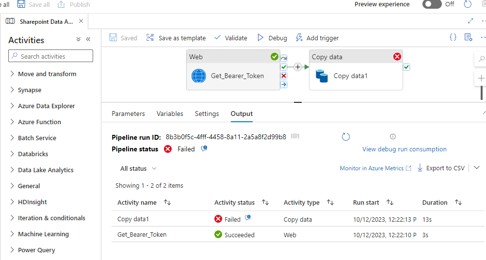 for this process I registred app in azure and then grant the application access to the sharepoint online site ..after this i created pipeline in azure using web activity connected parallel with copy data using sink HTTPS ..but as a result iam unable to download file from sharepoint ... the error was given by copy activity