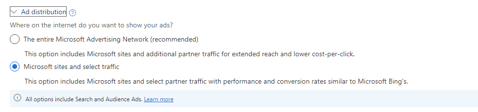 - The entire Microsoft Advertising Network (recommended). This option includes: