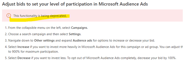 • We do see a setting for audience ads at the campaign level in Bing editor- will that ever be available for us to use? some of our accounts still have the option to add audience ad bid adjustment at the campaign level - for this particular client, it is no longer there so just curious.