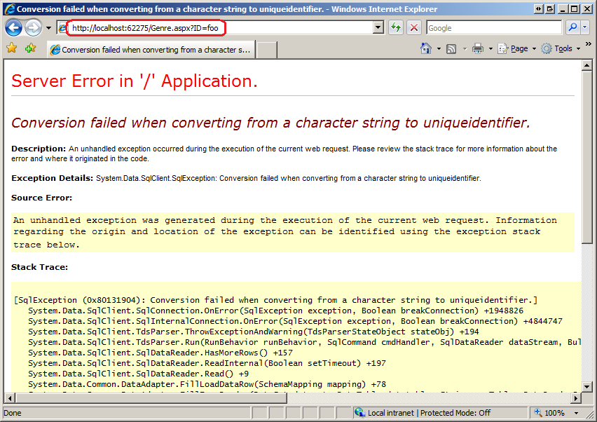 Figure 1 shows the Exception Details YSOD page. Note the URL in the browser's address window: http://localhost:62275/Genre.aspx?ID=foo. Recall that the Genre.aspx page lists the book reviews in a particular genre. It requires that GenreId value (a uniqueidentifier) be passed through the querystring; for example, the appropriate URL to view the fiction reviews is Genre.aspx?ID=7683ab5d-4589-4f03-a139-1c26044d0146. If a non-uniqueidentifier value is passed in through the querystring (such as "foo") an exception is thrown.